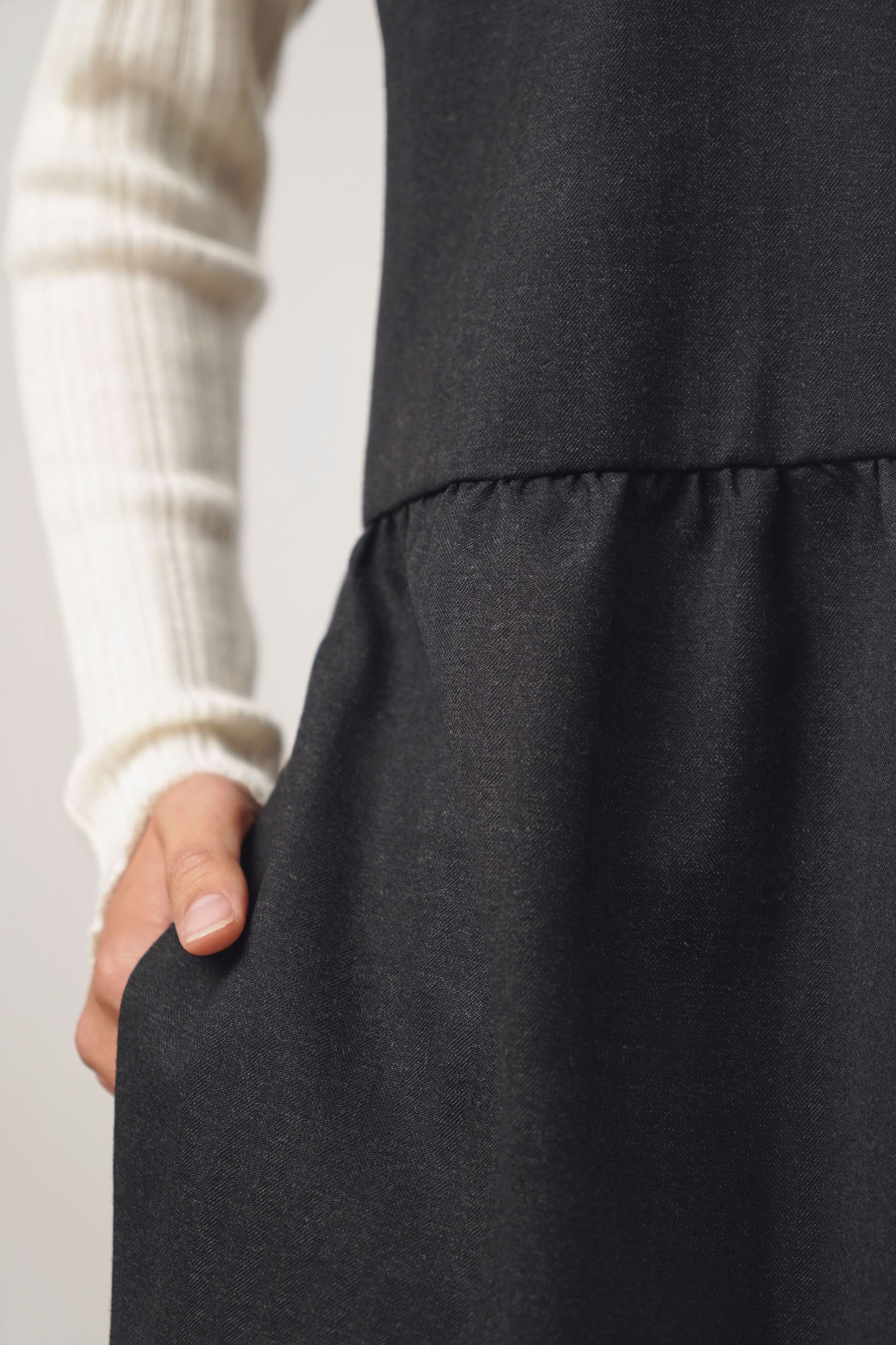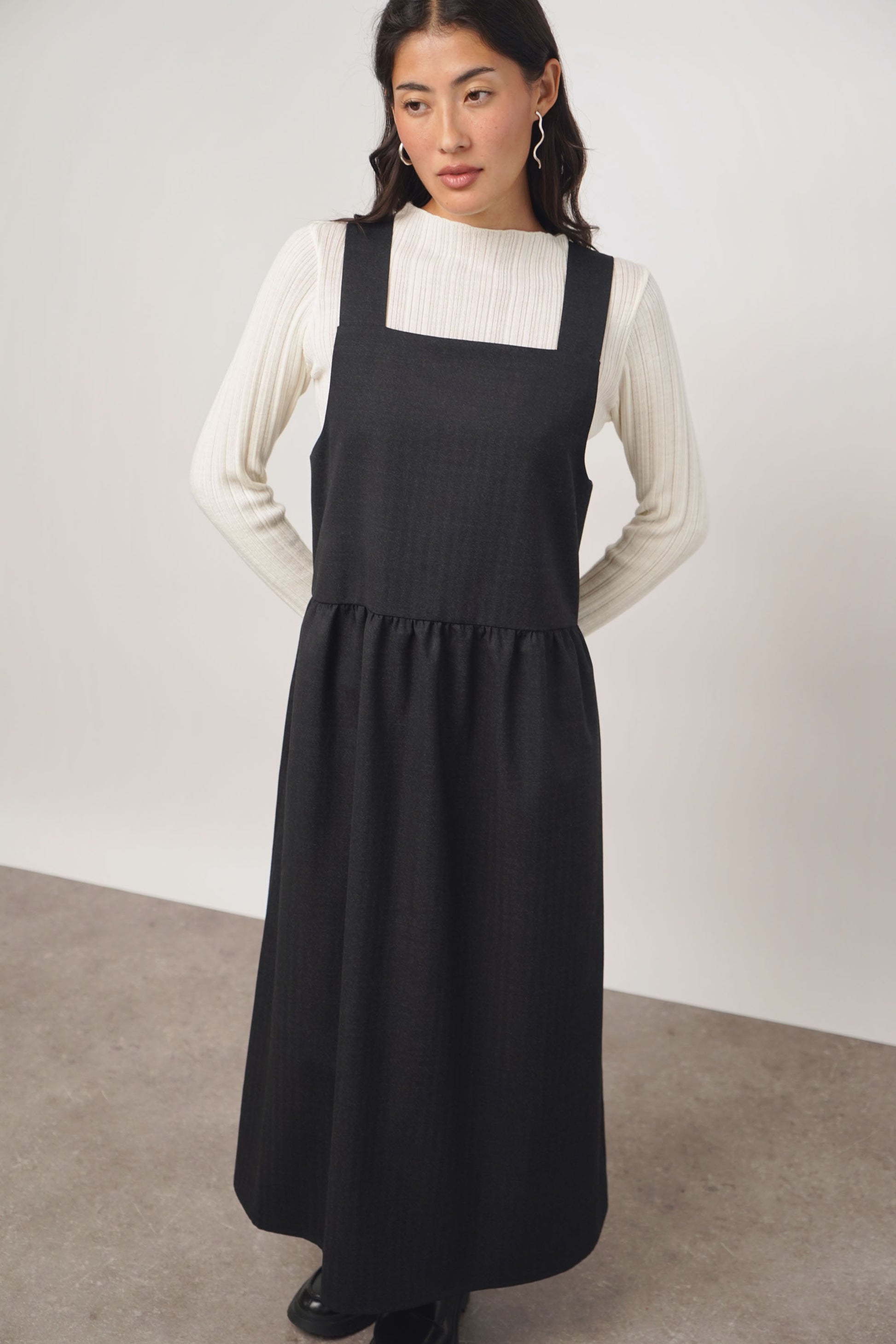 Der neu entwickelte Schnitt, ein weit geschnittenes Latzkleid. Mit Teilungsnaht und angezügeltem Unterteil. Hinten sind die Träger mit Knöpfen verstellbar. Das Kleid hat seitliche Eingriffstaschen und der Saum ist mit einer Elastikcordel inkl. Cordstopper versehen, so kann der Saum weit in A-Form Linie getragen werden oder zusammengezogen wird es mehr zur O-Form. Gefertigt aus einem fliessenden Wollstoff mit dezenter Streifenoptik. Limitiert auf 10 Stück.
