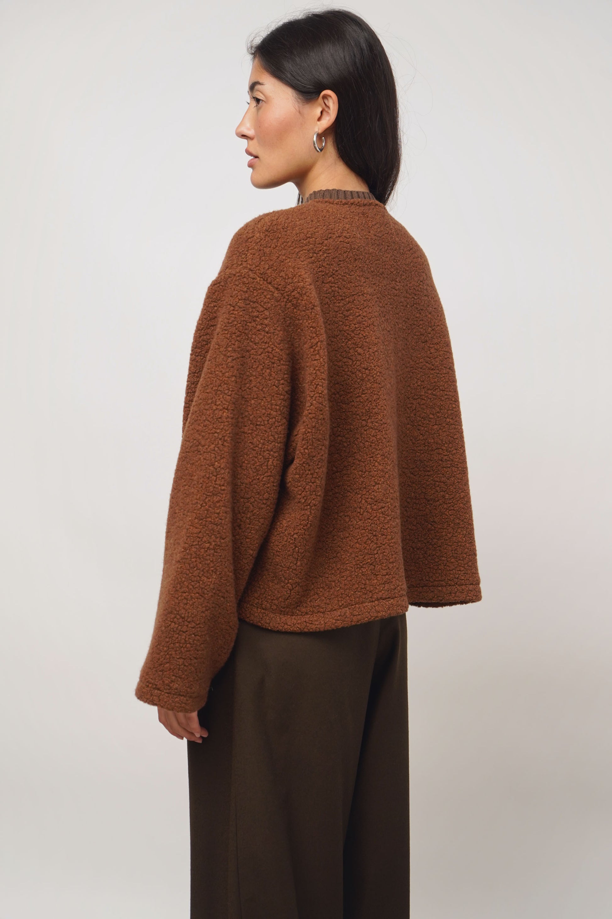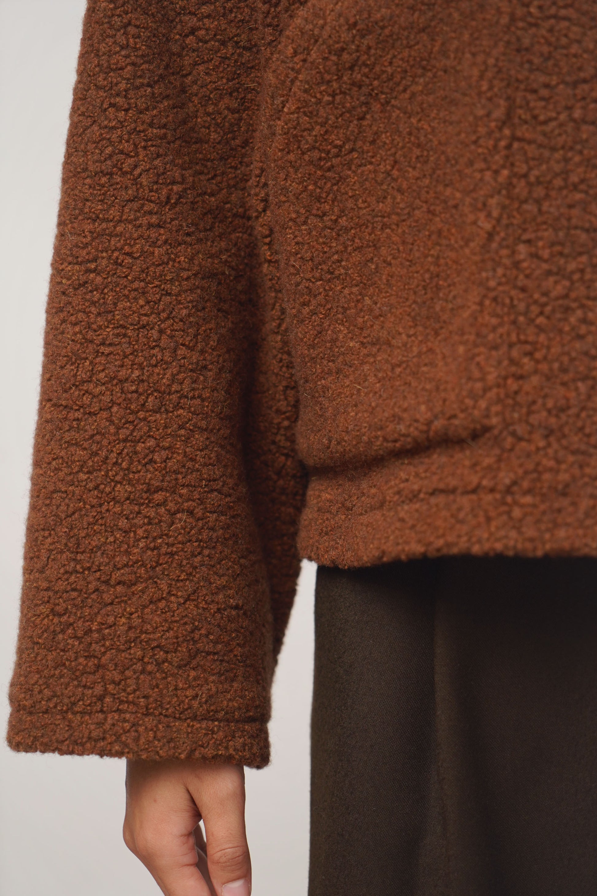 Kurz und kastig geschnittene Jacke, ohne Kragen, mit grossen aufgesetzten Taschen. Gefertigt aus einem kuschlig weichen Teddyplüsch Stoff. Verschluss mit 4 Knöpfen aus recycleten Pflanzenfasern. Limitiert auf 15 Stück.