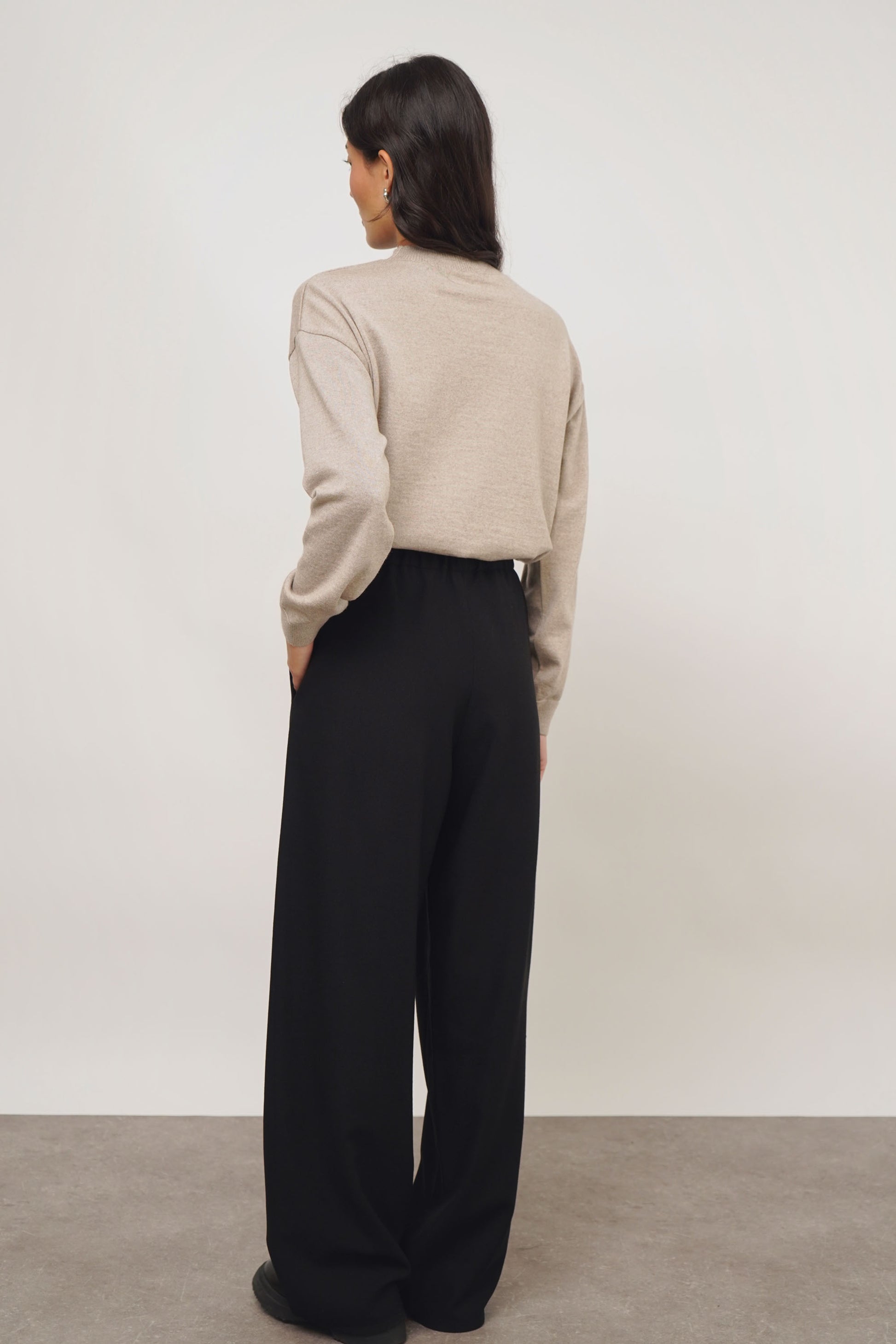 Weit geschnittene Hose mit Bundfalten, Reissverschluss und seitlichen Eingriffstaschen. Das Bein ist gerade und lang geschnitten. Vorne liegt der Bund flach, hinten ist der Stoff etwas angezügelt und mit Elastikbund. Gefertigt aus einem schön fallenden, knitterfreien Wollstoff. Limitiert auf 24 Stück.