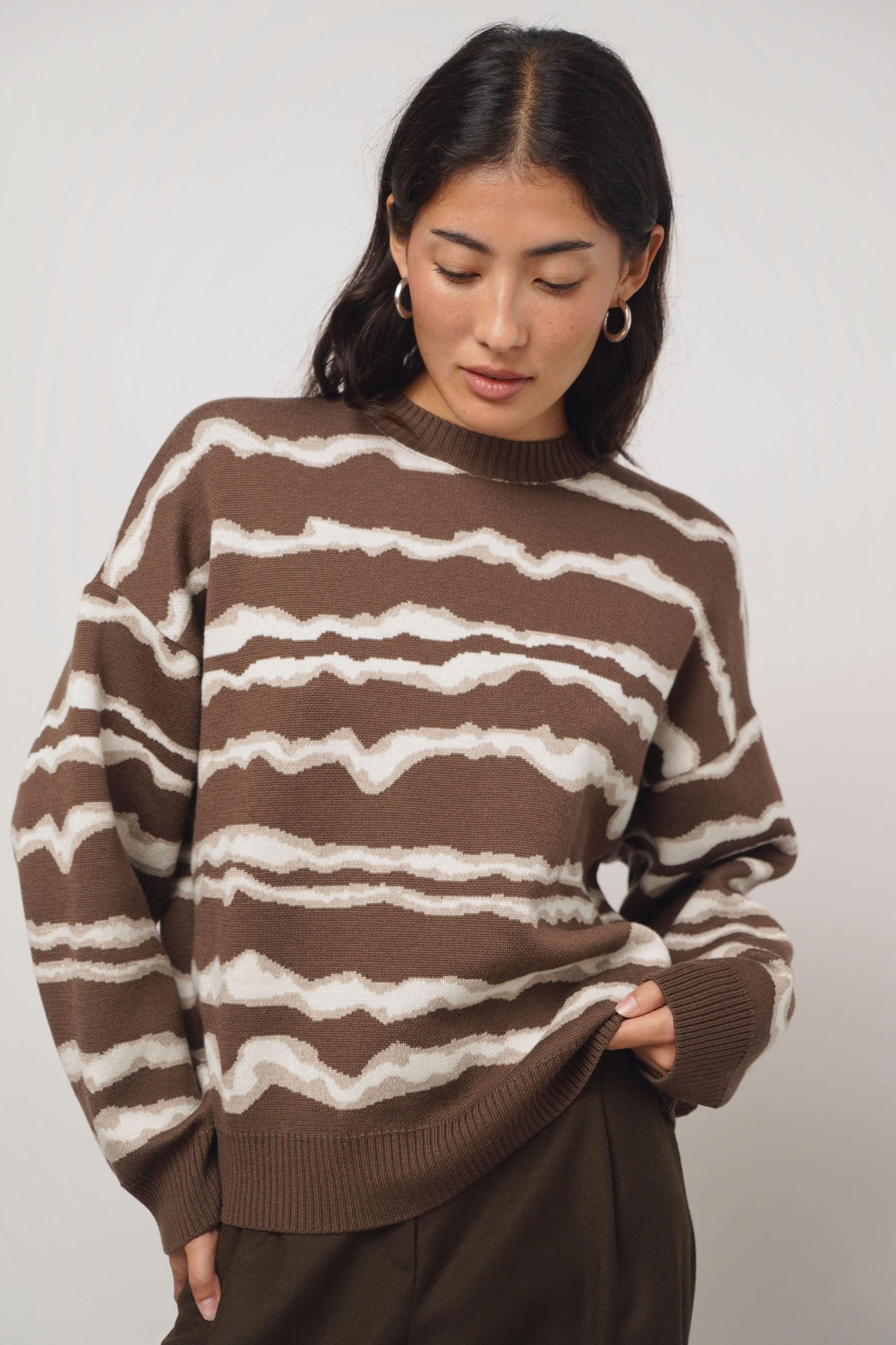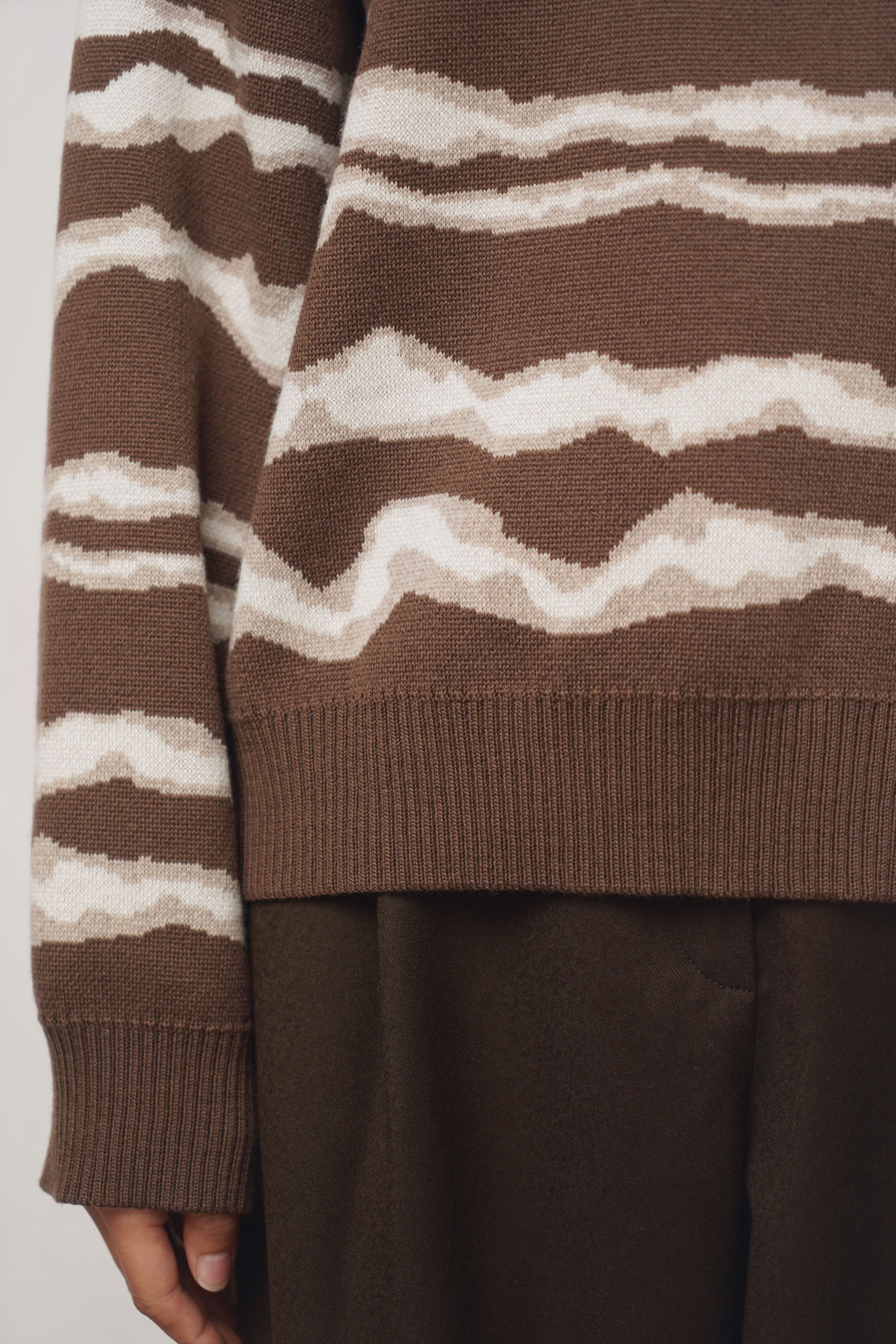 Drei-farbig gestrickter Pullover in chocolate, beige und natur. Die wunderschönen Steinstrukturen in Korsika haben mich zu diesem Muster inspiriert. Kuschlig weich, mit Bortenabschlüssen an Ärmel und Saum. Limitiert auf 15 Stück.