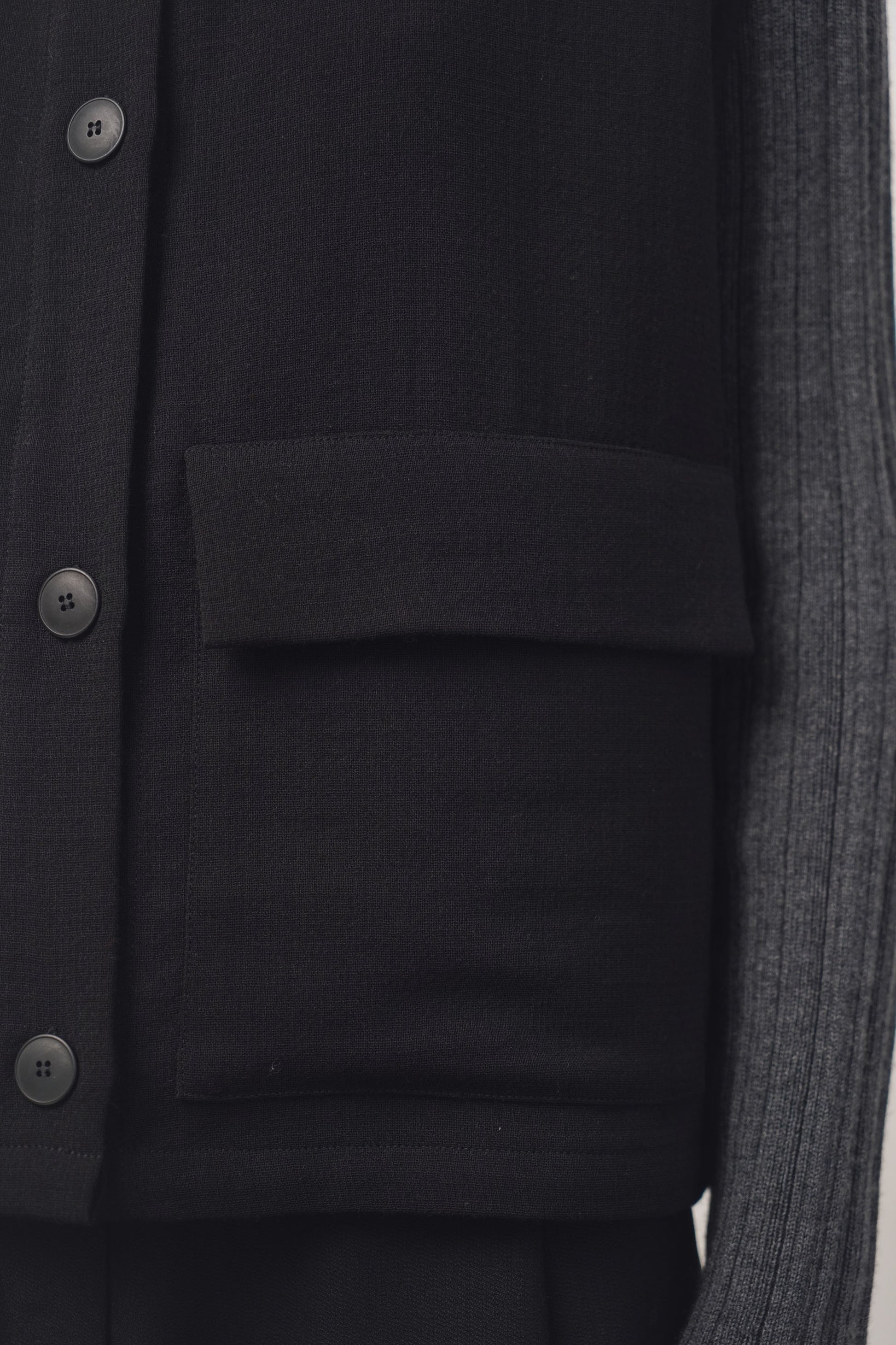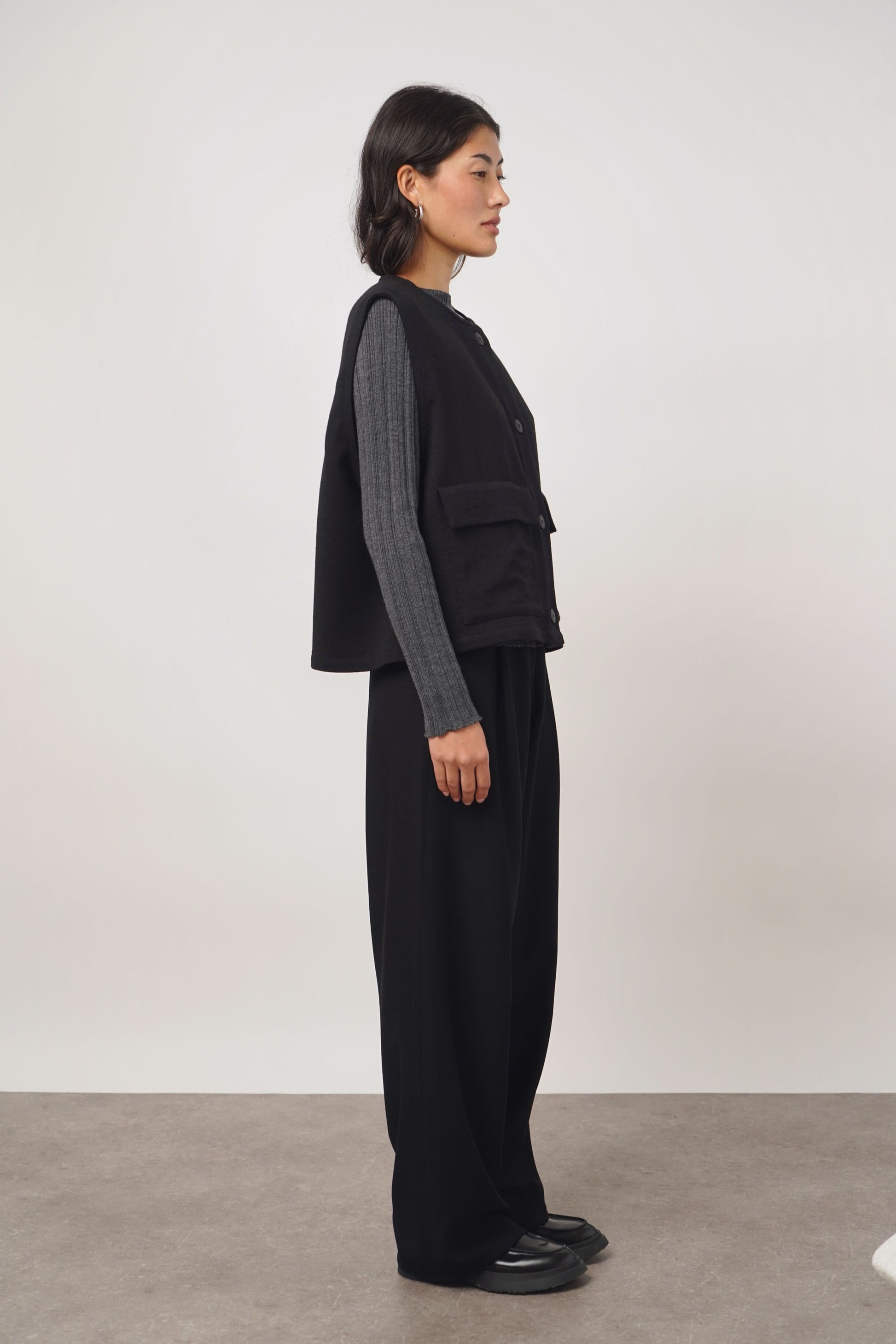 Weit und kastig geschnittene Weste mit grossen aufgesetzten Taschen. Gefertigt aus einem hochwertigen schwarzen Wollcrepe. Mit den grosszügigen Armlöchern ist die Weste perfekt kombinierbar über jedes Outfit. Verschluss mit 4 Knöpfen aus recycleten Pflanzenfasern. Limitiert auf 18 Stück.